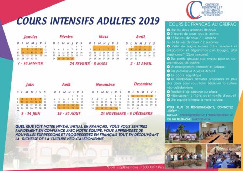 Que vous soyez résidents étrangers en Nouvelle-Calédonie ou de passage, vous avez la possibilité de suivre des cours de français à tous moments de l’année. Nos cours respectent le CECRL et vous permettront de travailler les quatre compétences afin que vous vous sentiez rapidement à l’aise tant à l’écrit qu’à l’oral.